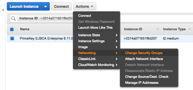 - Select your EJBCA Enterprise Instance (or right click on it) and select: Networking > Change Security Groups.