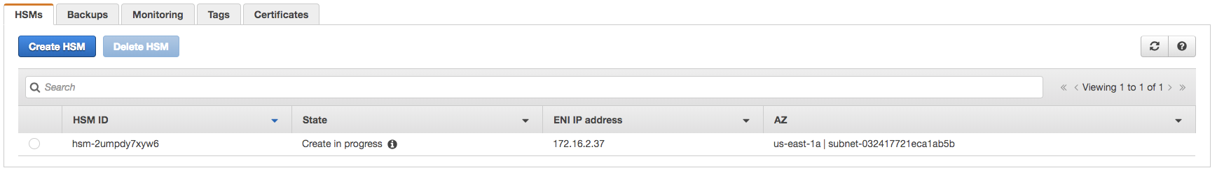 - Once completed it will take some time for AWS to create the HSM. During this time the state will be "Create in progress".
