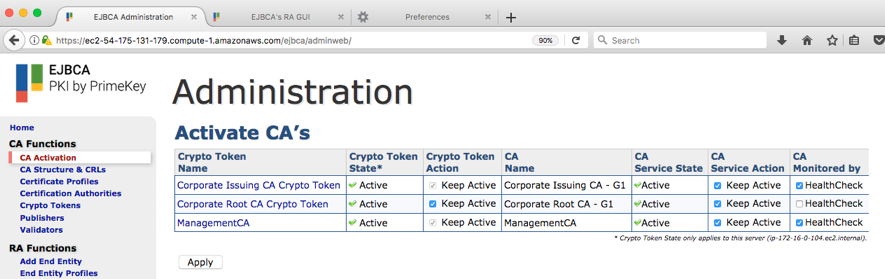 Health checks allow ensuring that the CAs service availability is monitored by the EJBCA Health Check service which can be supervised by a system such as Nagios or Solar Winds. The EJBCA Health Check service can also be used by systems such as F5 load balancers to ensure that the system is running.