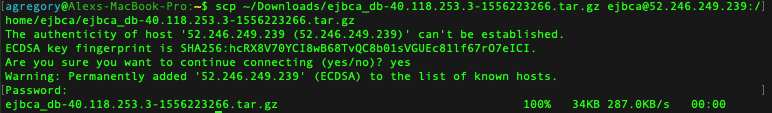 # scp ~/Downloads/ejbca_db-40.118.253.3-1556223266.tar.gz ejbca@52.246.249.239:/home/ejbca/ejbca_db-40.118.253.3-1556223266.tar.gz