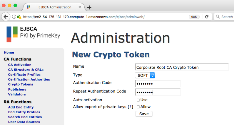 - Allow export of private keys: This is an option since we are using soft keystores. To allow exporting of keys, select Allow. If cleared, EJBCA will try to prevent export.