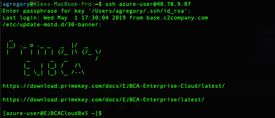 If you selected ssh key access when procuring your instance, use the SSH key you selected when procuring the instance. If you chose username and password, use the combination you chose at launch time to SSH into the EJBCA Cloud instance. For example, for azure-user with an IP address of 40.78.9.87 use the following: