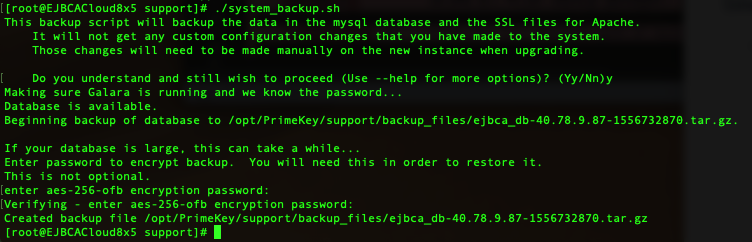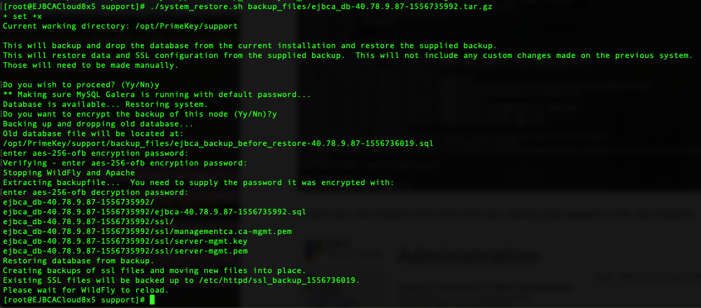 system_restore.shby pointing it to the backup file location after the script. In this example, the backup file is located in/home/azure-user/and the file name is ejbca_db-40.78.9.87-1556732870.tar.gzCODE# /opt/PrimeKey/support/system_restore.sh /home/ec2_user/ejbca_db-40.78.9.87-1556732870.tar.gzConfirm the script once prompted to continue.