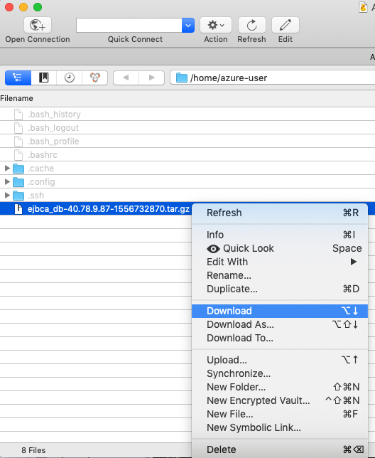 If using the CLI, the command will be a bit different since you are copying local to remote.CODE# scp ~/Downloads/ejbca_db-40.78.9.87-1556732870.tar.gz azure-user@52.246.249.239:/home/azure-user/