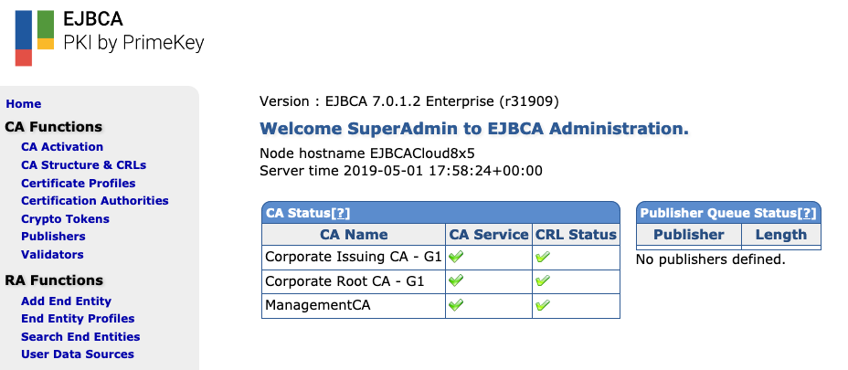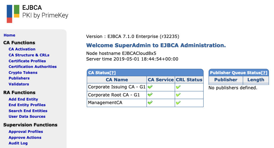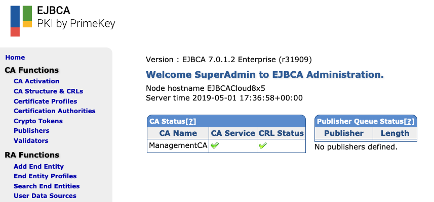 - Note the version of the new instance in the top-right corner of the EJBCA Administration home screen, in this example Version: EJBCA 7.1.0 Enterprise (r26978).