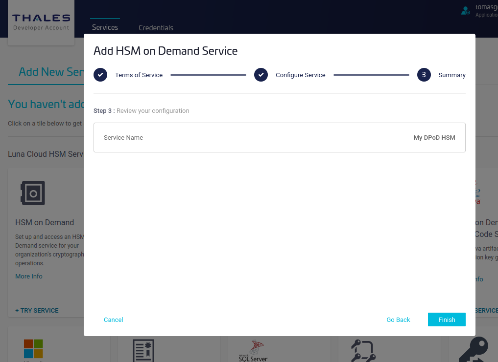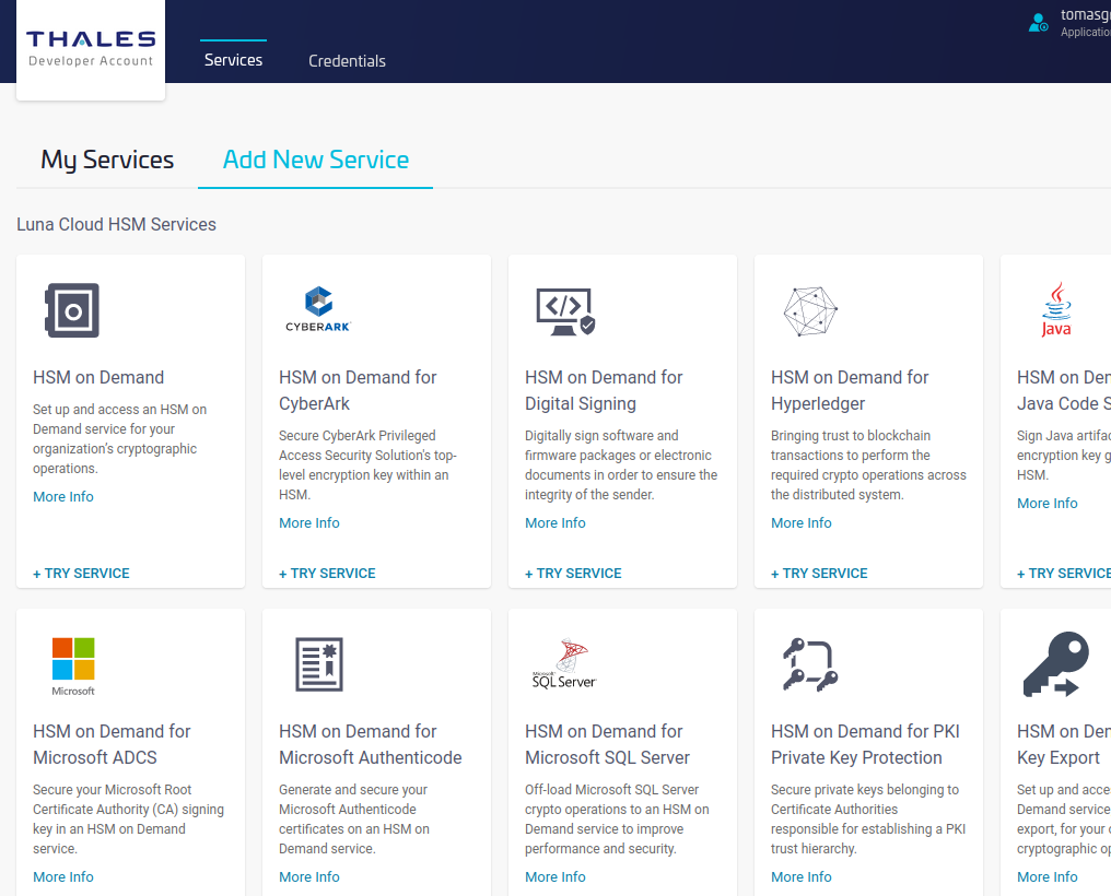 - To create a new service for HSM on Demand, click Try Service to start the wizard.