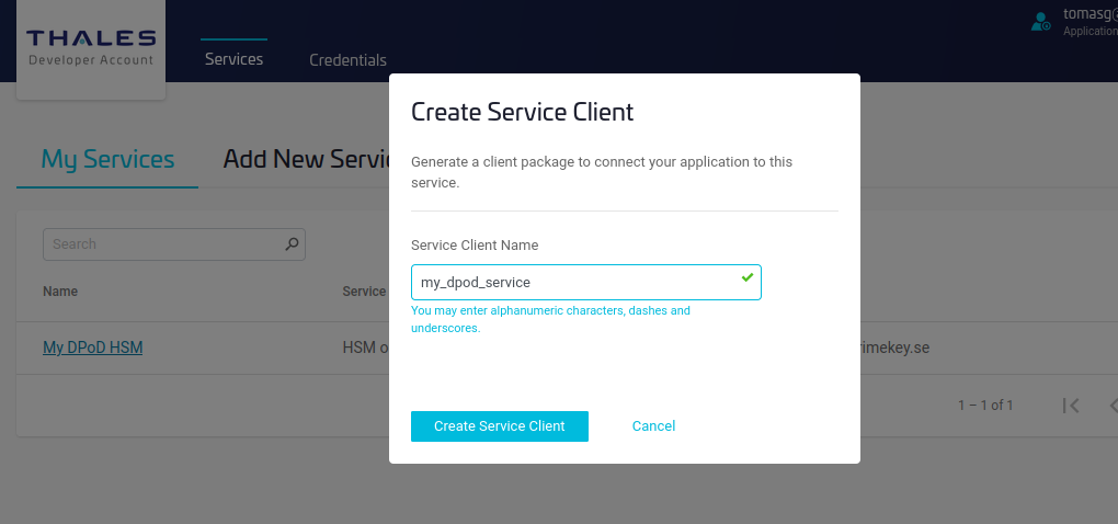 - Specify the name of the service client and click Create Service Client.