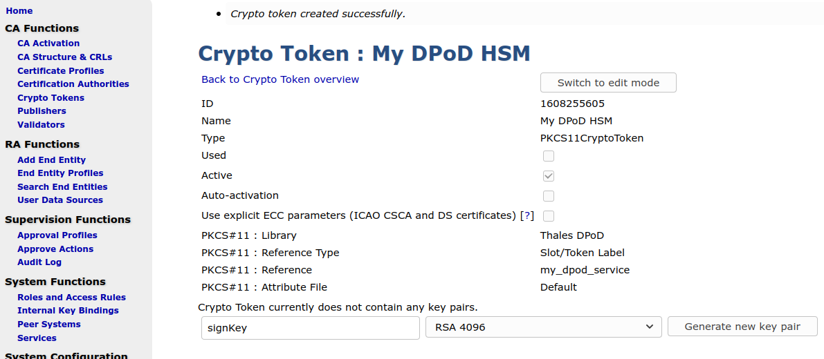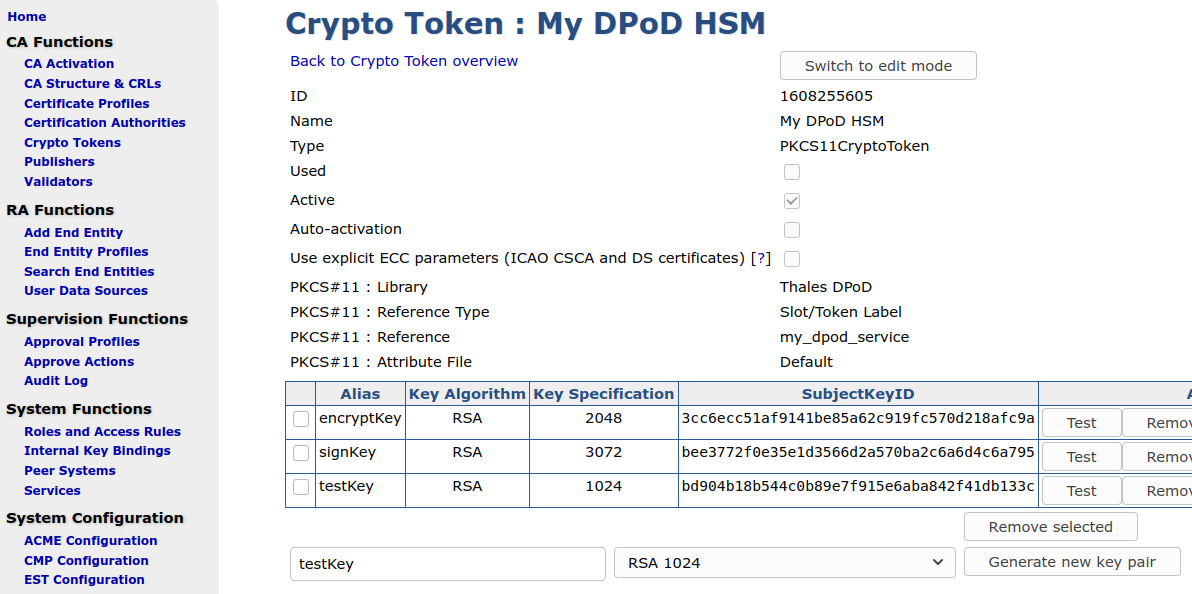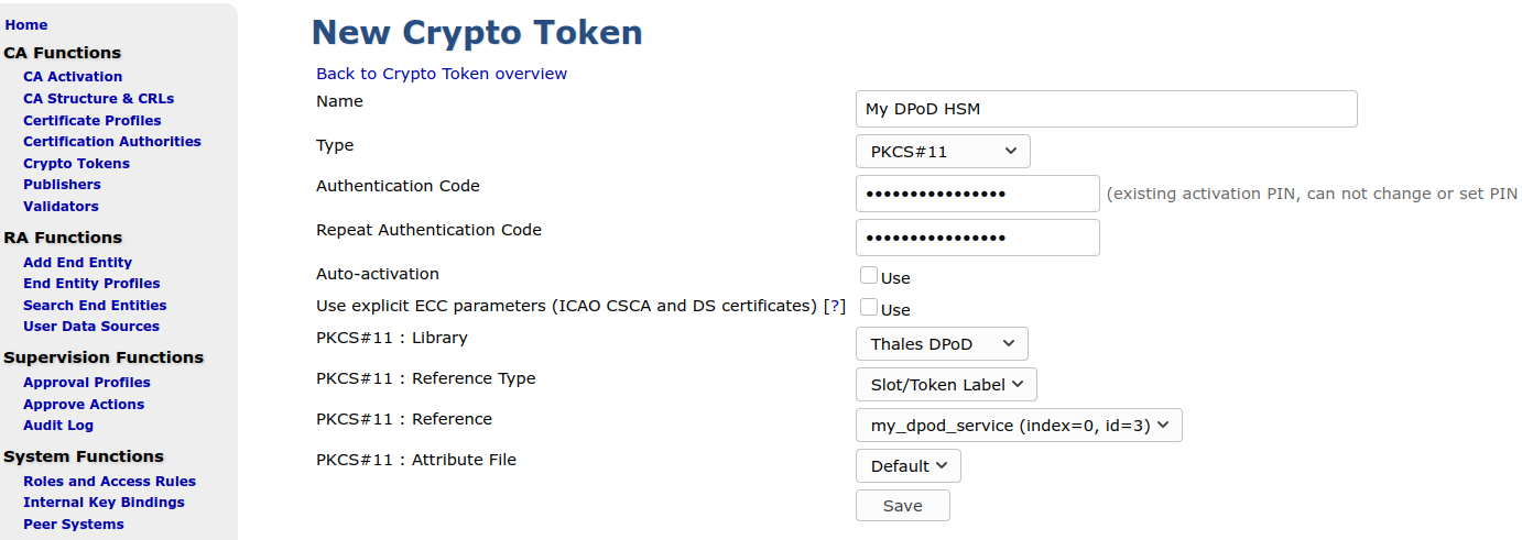After starting EJBCA, you can generate a new PKCS#11 Crypto Token utilizing the Thales DPoD library (located in /opt/thales/dpodclient/libs/64/libCryptoki2.so), using either the EJBCA Admin UI or the EJBCA CLI.