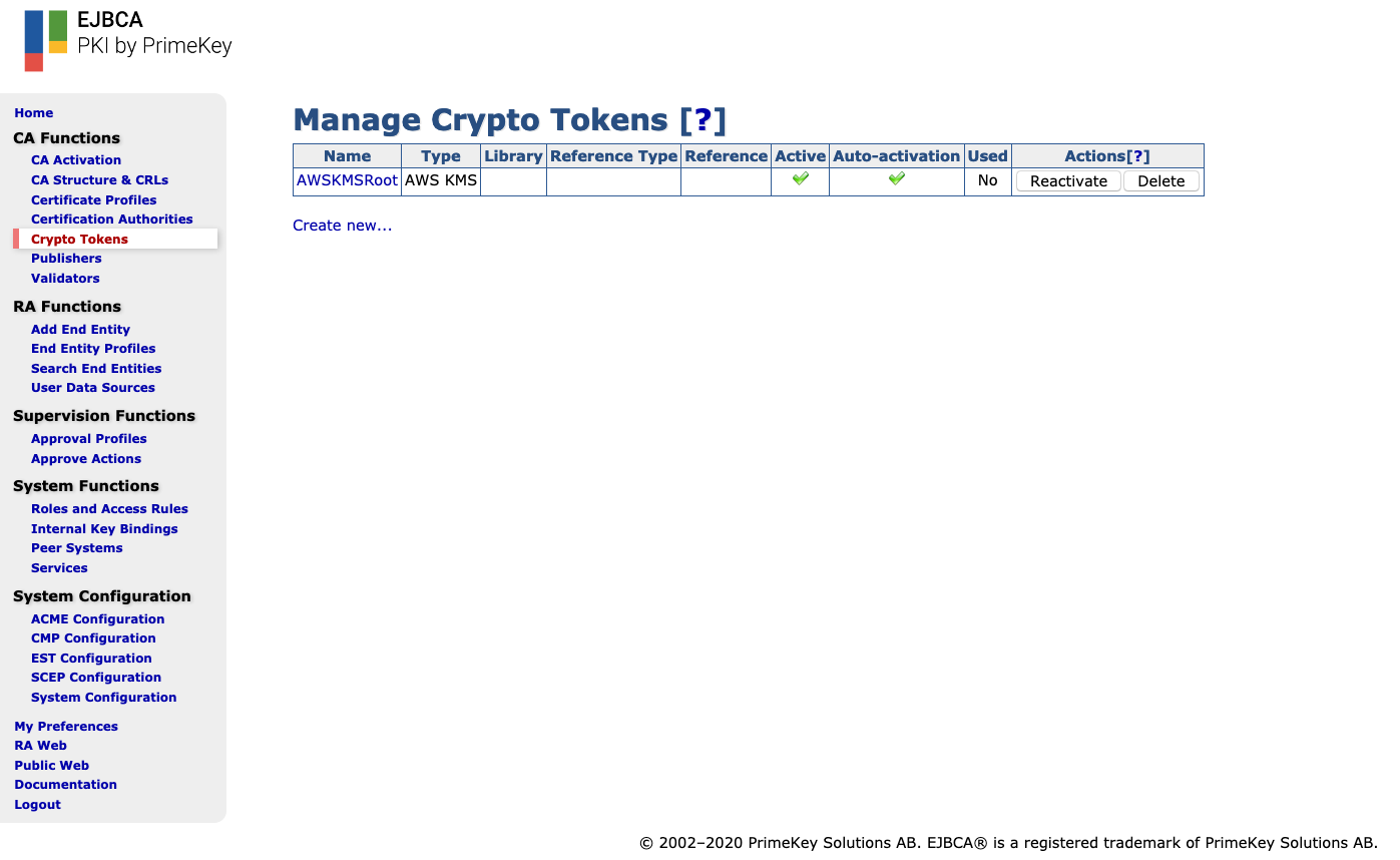 For more information on Crypto Tokens, refer to the EJBCA Documentation on Crypto Tokens Overview as well as Managing Crypto Tokens.