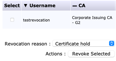 - Select a revocation reason (Certificate hold is the only reversible option), and click Revoke Selected.