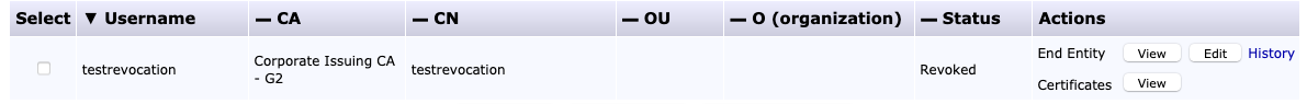 BASHopenssl verify -crl_check -CAfile crl_chain.pem device_cert.pemThe certificate can then be temporarily revoked. Search for the End Entity of the device certificate in Search End Entities under RA Functions (status = all is easiest), and select the box next to the End Entity with the certificate to be revoked.