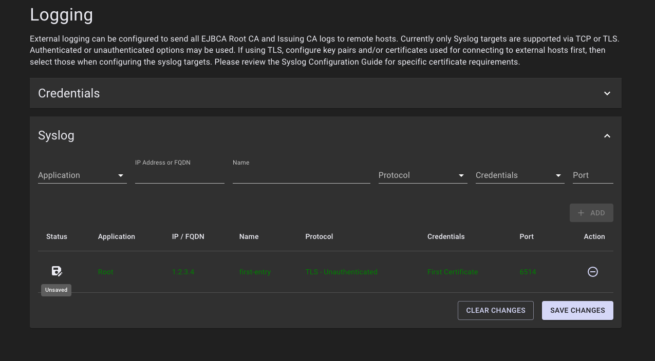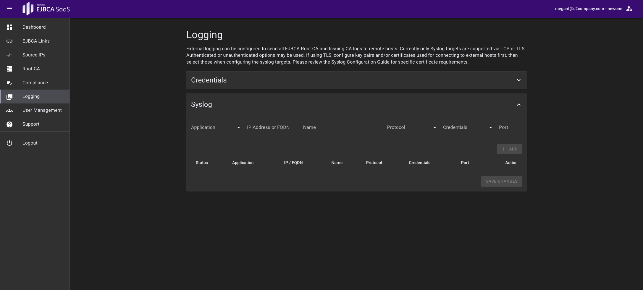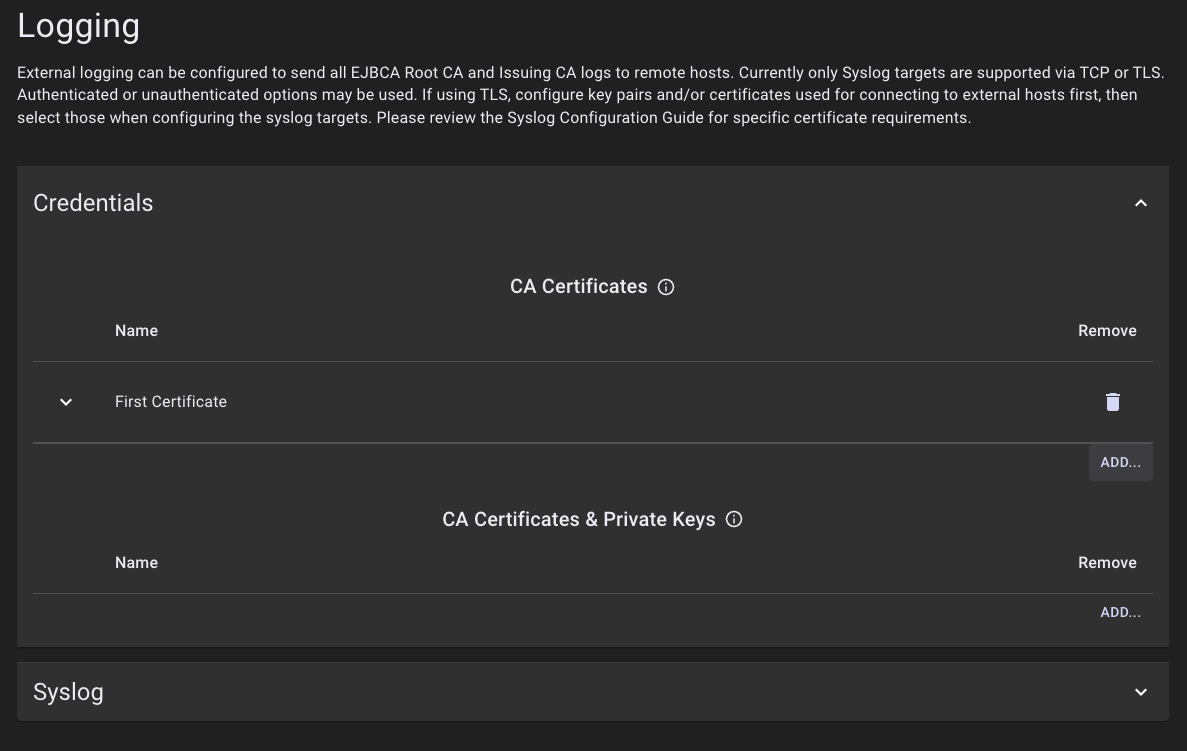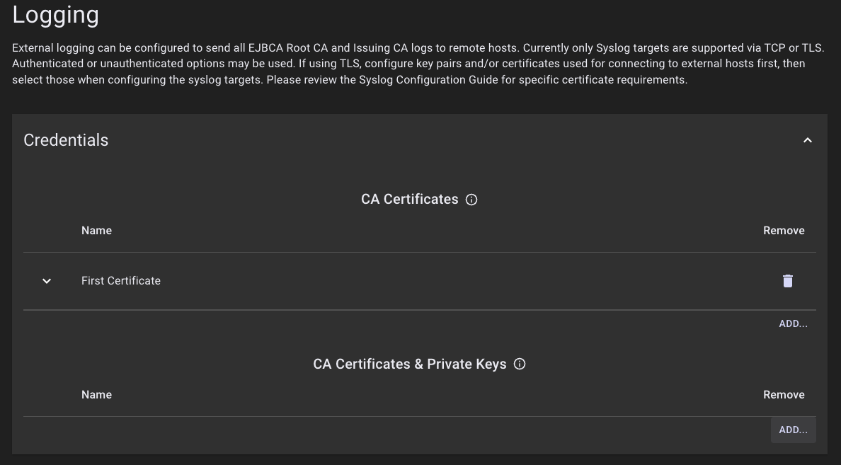 EJBCA SaaS supports streaming logs to an external logging server. The following covers how to configure syslog log streaming of the Issuing and Root CA, HTTPd and EJBCA logs to remote syslog servers.