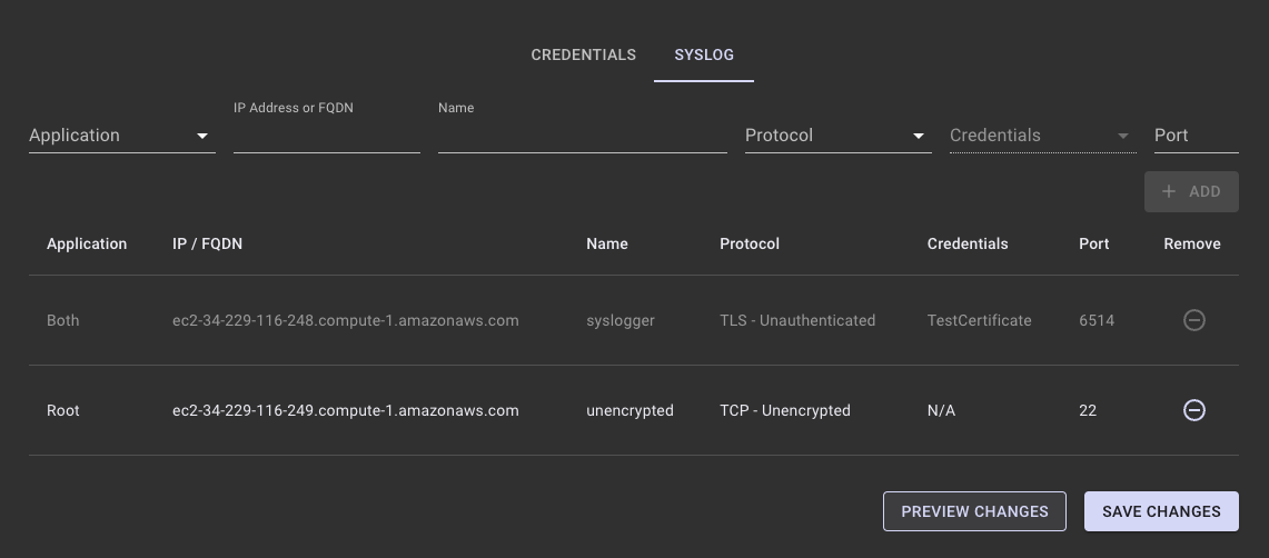 - TLS Unauthenticated Logger: TLS Unauthenticated logger configurations require a CA certificate (or trust store) to be uploaded via the portal, to perform server validation of the remote syslog server.