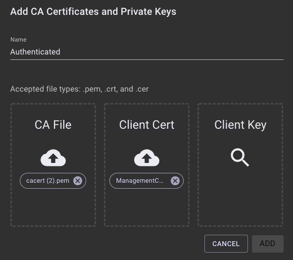 - Specify a name for the credential entry and drag a CA file, a client certificate, and a client private key PEM file into the drop zone area, and then click Add. The CA file must contain the trust store for the remote syslog server's TLS certificate. The client certificate will be verified against the CA file configured on the remote syslog server.