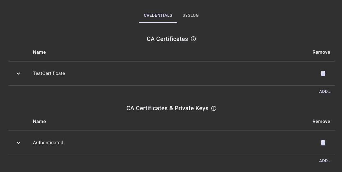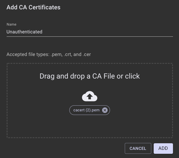 - Specify a name for the credential entry and drag a CA Certificate PEM file into the drop zone area, then click ADD. The PEM file must contain the trust store for the remote syslog server's TLS certificate.