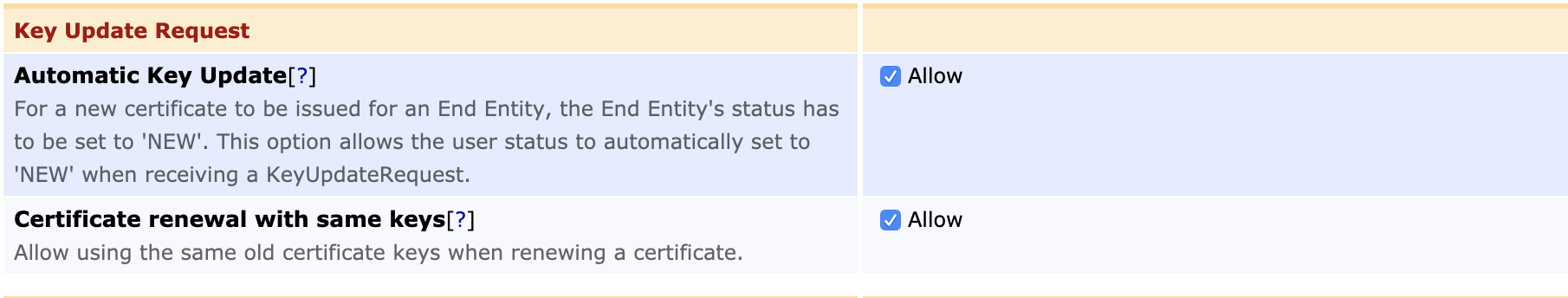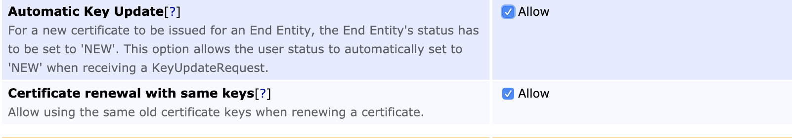 Allow Certificate Renewal with Same Keys | Allow |