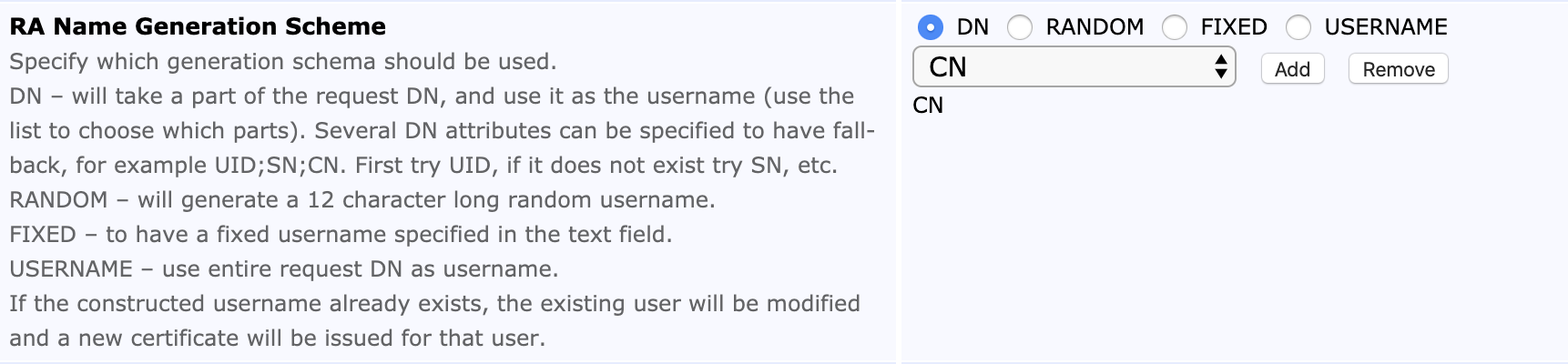RA Name Generation Scheme | DN and specify the DN part to be usee as the username |