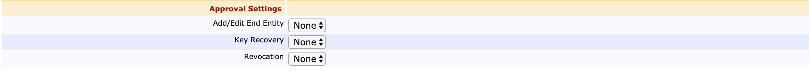 | Add/Edit End Entity | Requiring Approvals for this action will require approval for any operations involving enrollment or in any way editing an end entity, which includes changing status as a precursor for certificate renewal. |