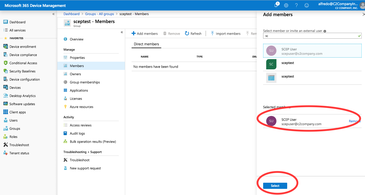 On the Select groups to include panel, select the sceptest group, click Select, and then click Save.