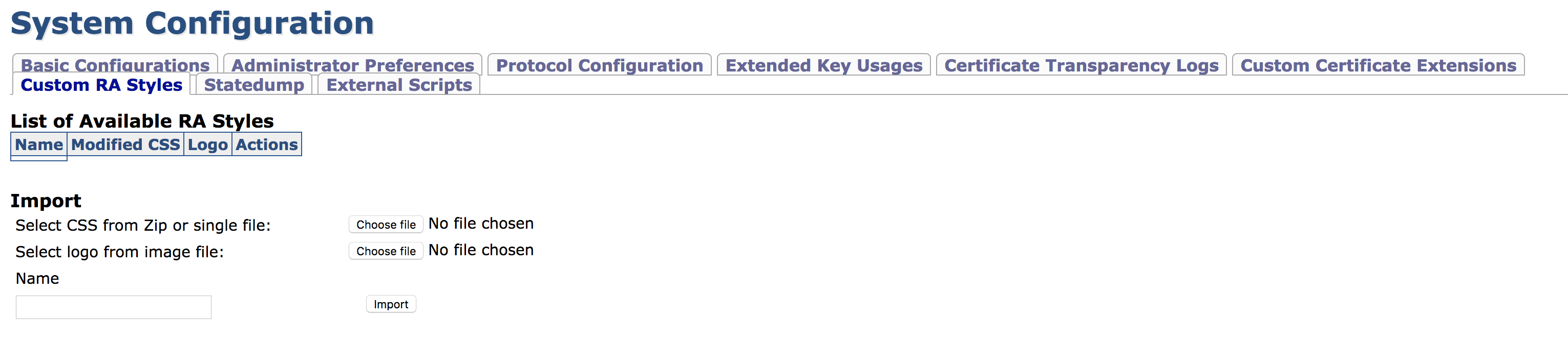 Once styles are uploaded, it has to be bound to a role to take effect. To apply a custom style to a role, go to CA UI → Roles and Access Rules and select the desired style from the RA Styles list menu. The next time members of this role login to the RA Web, their new style is applied. Keep in mind that images and CSS files are browser cached and changes might thus not appear until the browser cache is invalidated or cleared manually.