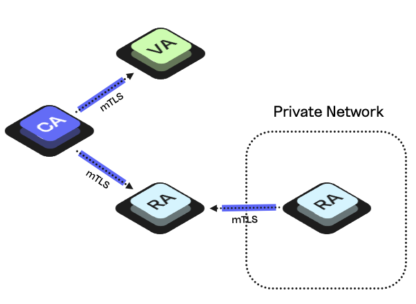 EJBCA 8.2 implements RA chaining support to enable zero trust hybrid and multi-cloud PKI deployments based on extended flexibility in distributed EJBCA deployments. The established EJBCA security model for separating the Registration Authority (RA) and Validation Authority (VA) from the Certificate Authority (CA) in EJBCA deployments is based on setting up mTLS-secured peer connections initiated from the CA to the RA and the VA. The associated network setup will normally not accept any incoming connections to the CA. Instead, all external communication is targeting the RA and VA and these communicate with the CA through the mTLS peer connections.