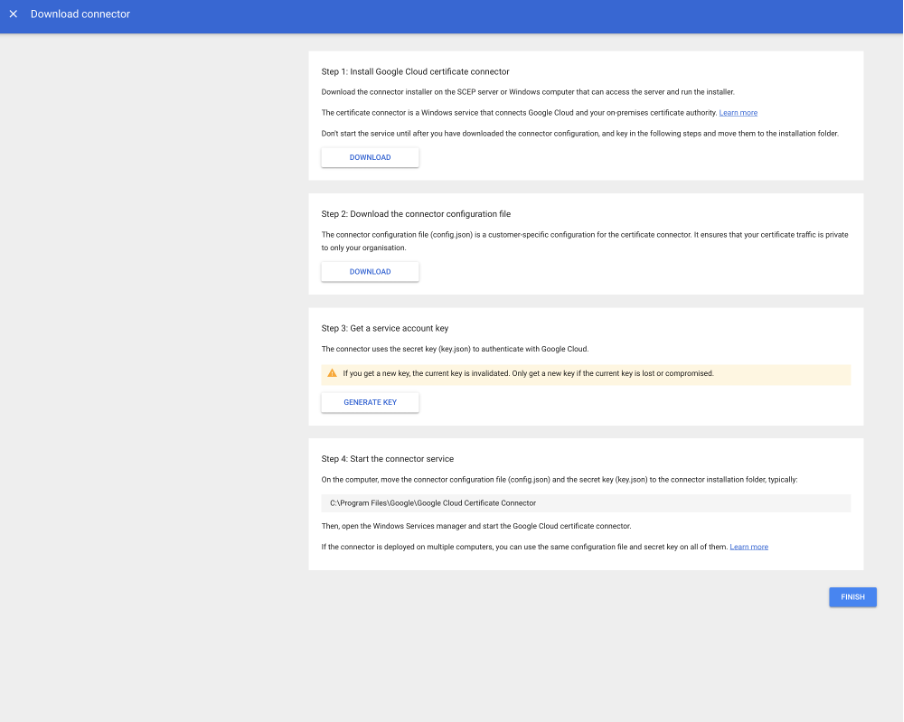 The Google Cloud Certificate Connector is downloaded when first setting up your Google Cloud account, as documented in the Google Help page Set up certificates for managed mobile devices. The Connector needs to be installed on a Microsoft Windows Server.