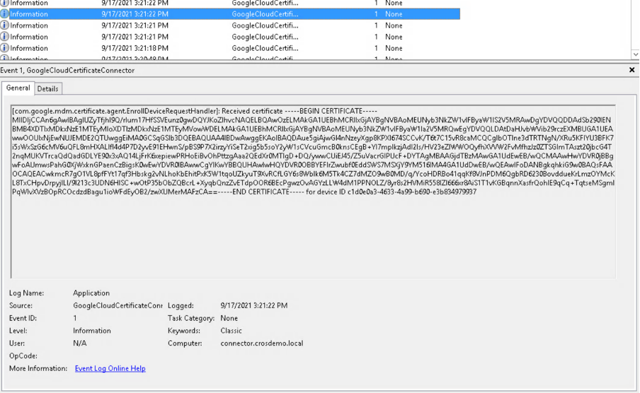 On the Google Cloud Certificate Connector event viewer, look for the following events: