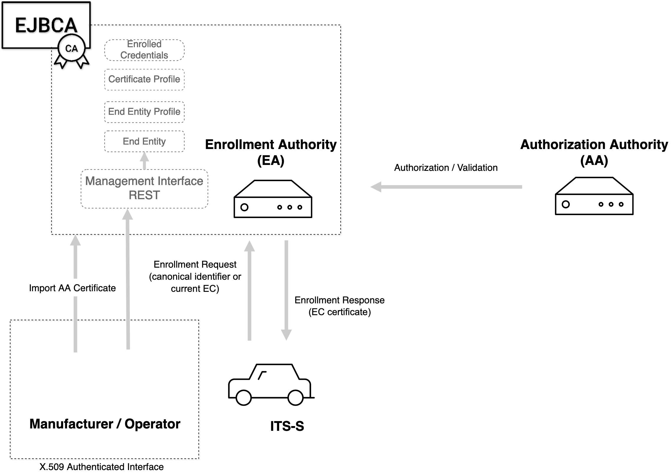 - Registration of ITS-S: ETSI mentions that EA must know the ITS-S in terms of a globally unique canonicalId and a canonical public key. The definition of this procedure is considered out of scope by ETSI and IEEE 1609.2. In EJBCA, this is referred to as registration and is done through REST Interface endpoints, referred to as Management Interface in the overview below.