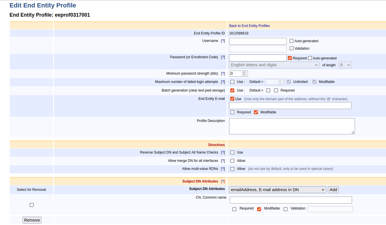 - endEntityProfileName: Use the name of the End Entity Profile created earlier.