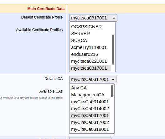 Do the same for the CAs and select Available CAs and then update the Default CA.