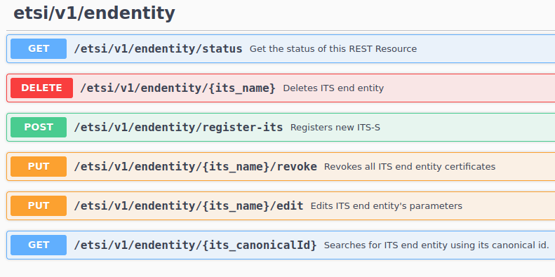 Registration of an ITS Station (ITS-S) End Entity is done by the Operator or Manufacturer. A collection of REST endpoints are created to manage these entities.