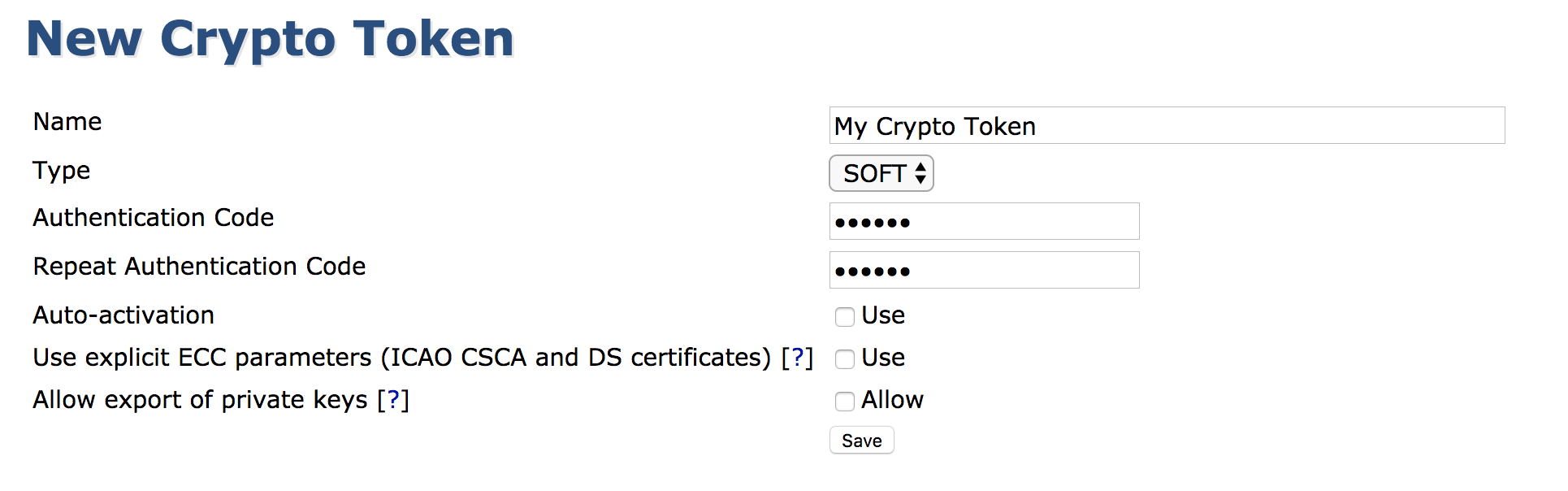 $ bin/ejbca.sh cryptotoken create --token "Cryptotoken 01" --pin "foo123" --type "SoftCryptoToken" --autoactivate "FALSE"