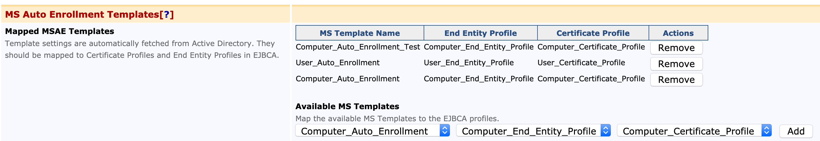 In order to enroll through Microsoft Auto-enrollment, the Microsoft Templates are mapped to End Entity Profiles and Certificate Profiles.
