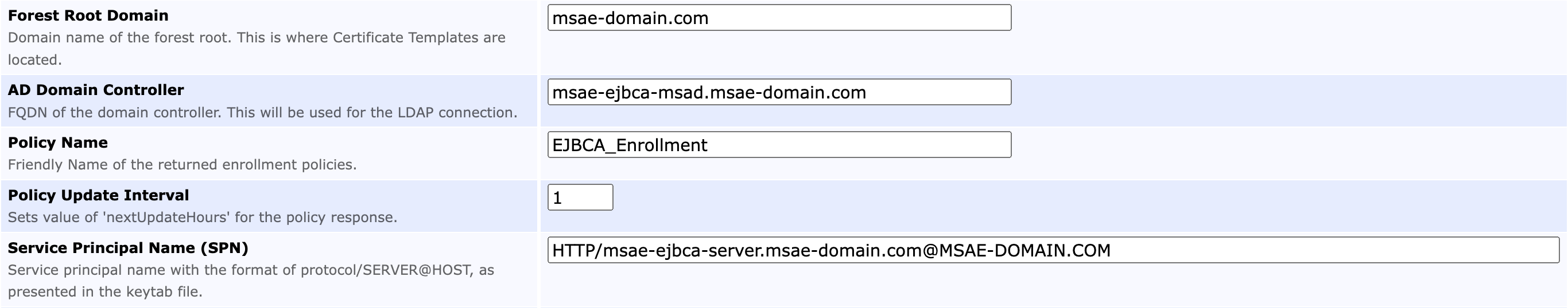 Forest Root Domain | Domain name (DN) of the forest root (the location of the Certificate Templates). |
