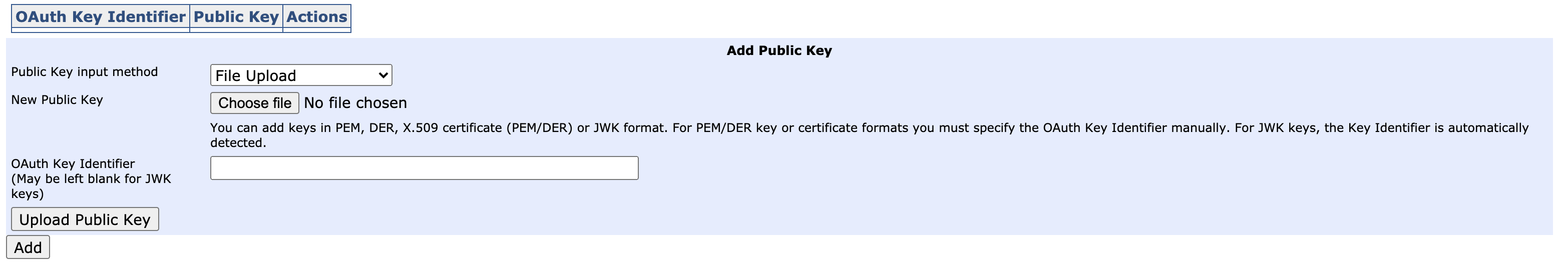 At the bottom of the page is a form for providing OAuth public key(s):