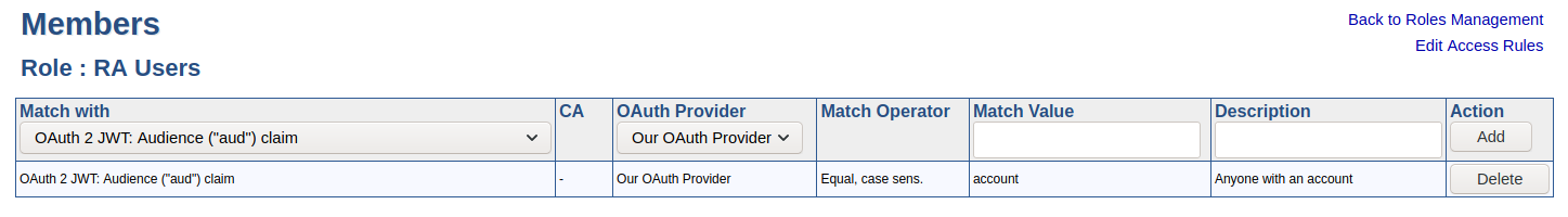 Claims in JWTs may be mapped to roles in EJBCA. A claim can represent a group of users or an individual user. EJBCA allows any combination of claims and even different authentication methods in a single role.