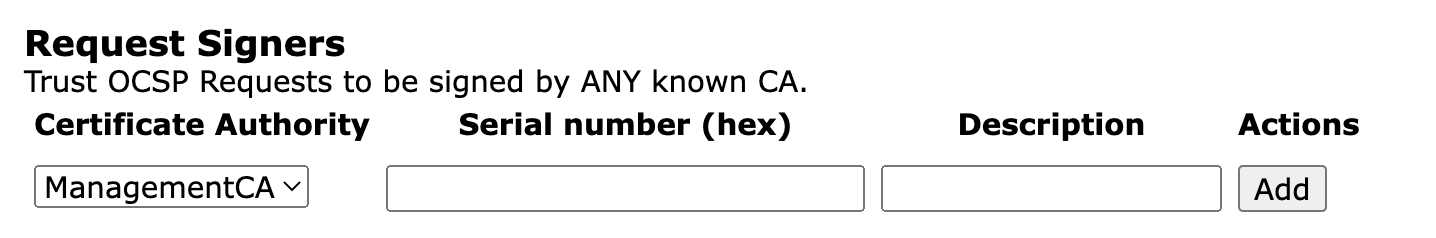 Each OCSP Responder can be set to require requests to be signed. If enabled (by setting Request must be signed with a trusted certificate below), the OCSP responder will accept requests signed by a key pair certified by any known CA.