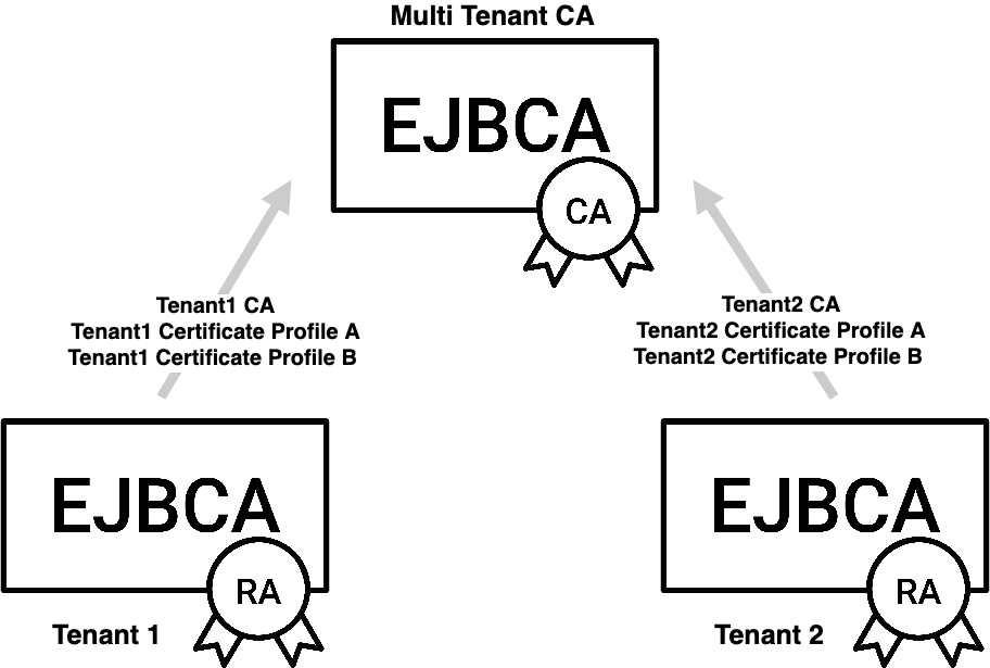 It is possible to configure EJBCA with Reverse Peers to achieve RA chaining. This solution is useful in cases where multiple Tenant RAs send requests to an EJBCA Cloud CA, but the customer does not want to accept incoming connections to their PKI.