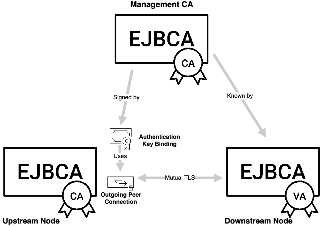 EJBCA solves the second requirement described above using a proprietary protocol named Peers Systems, based on mutually authenticated TLS. It builds on the following principles: