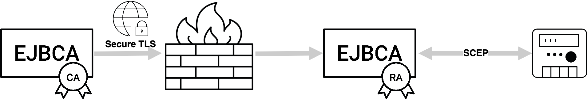 Like all other protocols in EJBCA, SCEP requests can be proxied to EJBCA over TLS through another EJBCA instance acting as RA in a DMZ. For more information on how to set this up, see the Peer Systems Operations page.