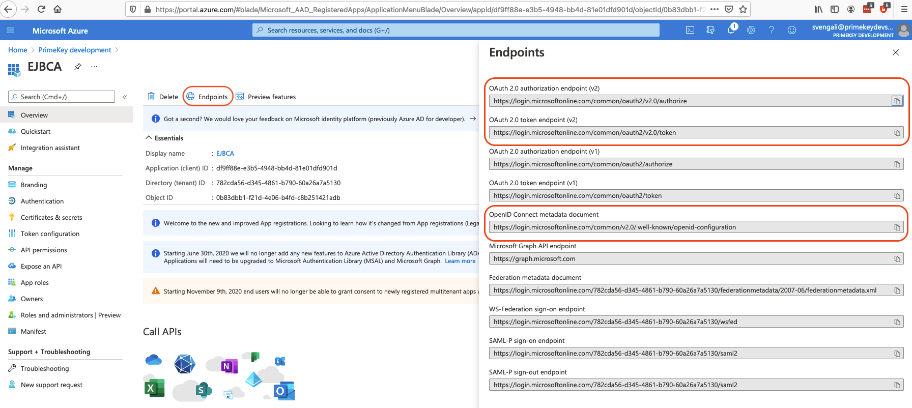 On the Azure portal EJBCA Overview page, click Endpoints and open the OpenID configuration.
