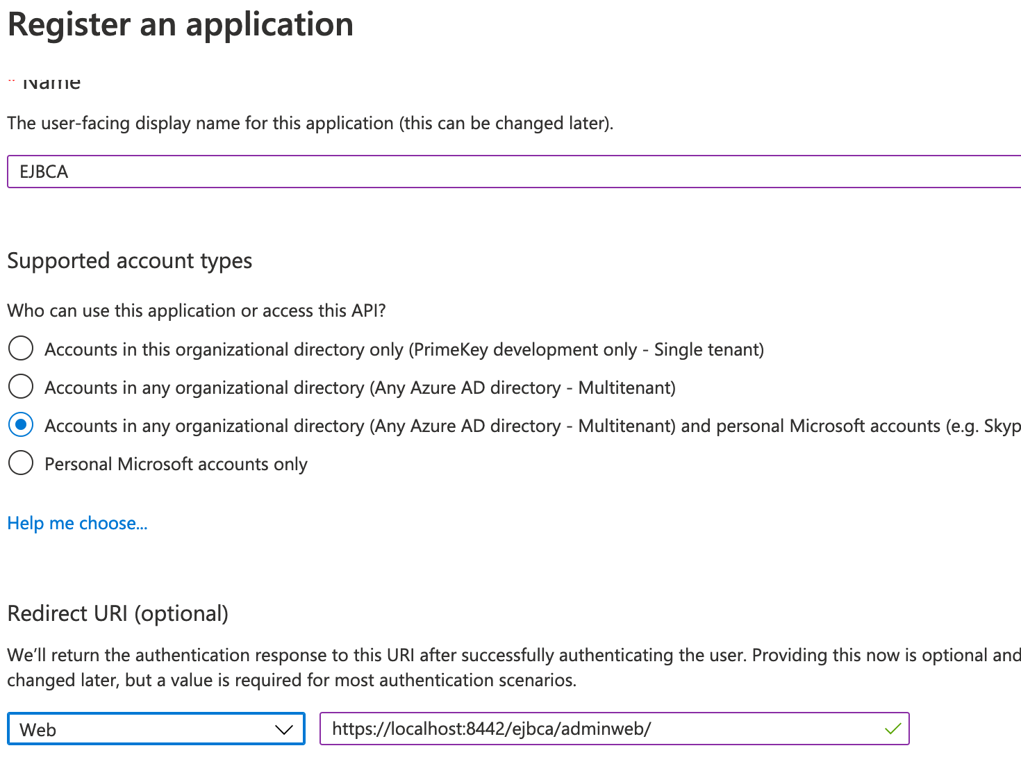 The following describes how to set up Azure Active Directory to test OAuth functionality in EJBCA.