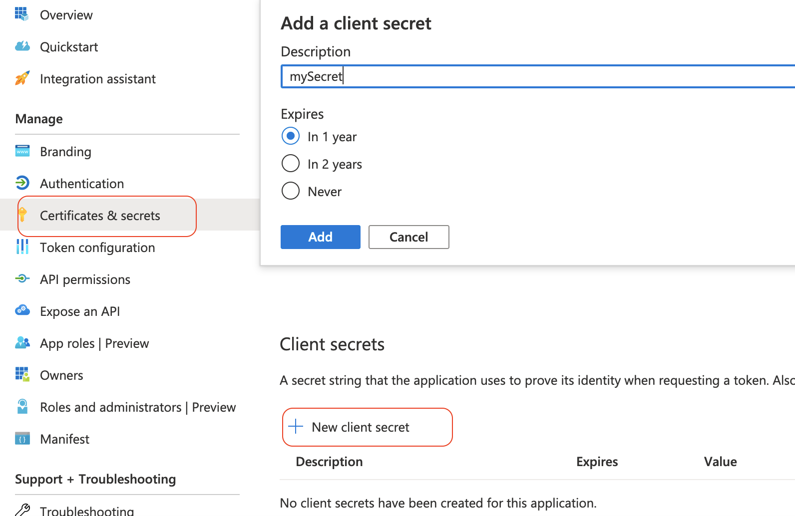 Add a description for the client secret, and click Add.