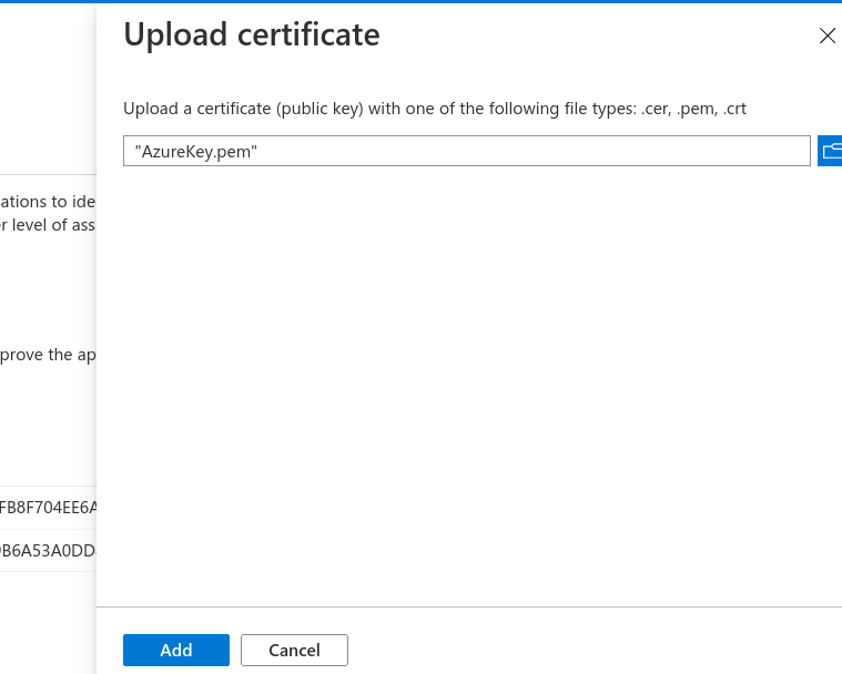 Go to Certificates & secrets in Azure and click Upload certificate. Select the PEM file downloaded above and click Add.