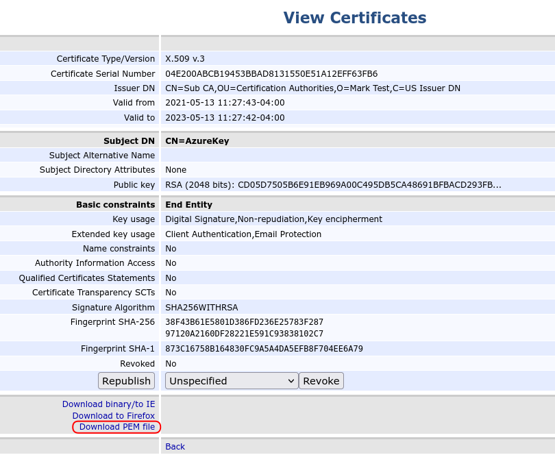 Select Download PEM file and save the certificate as a PEM file on the local file system.