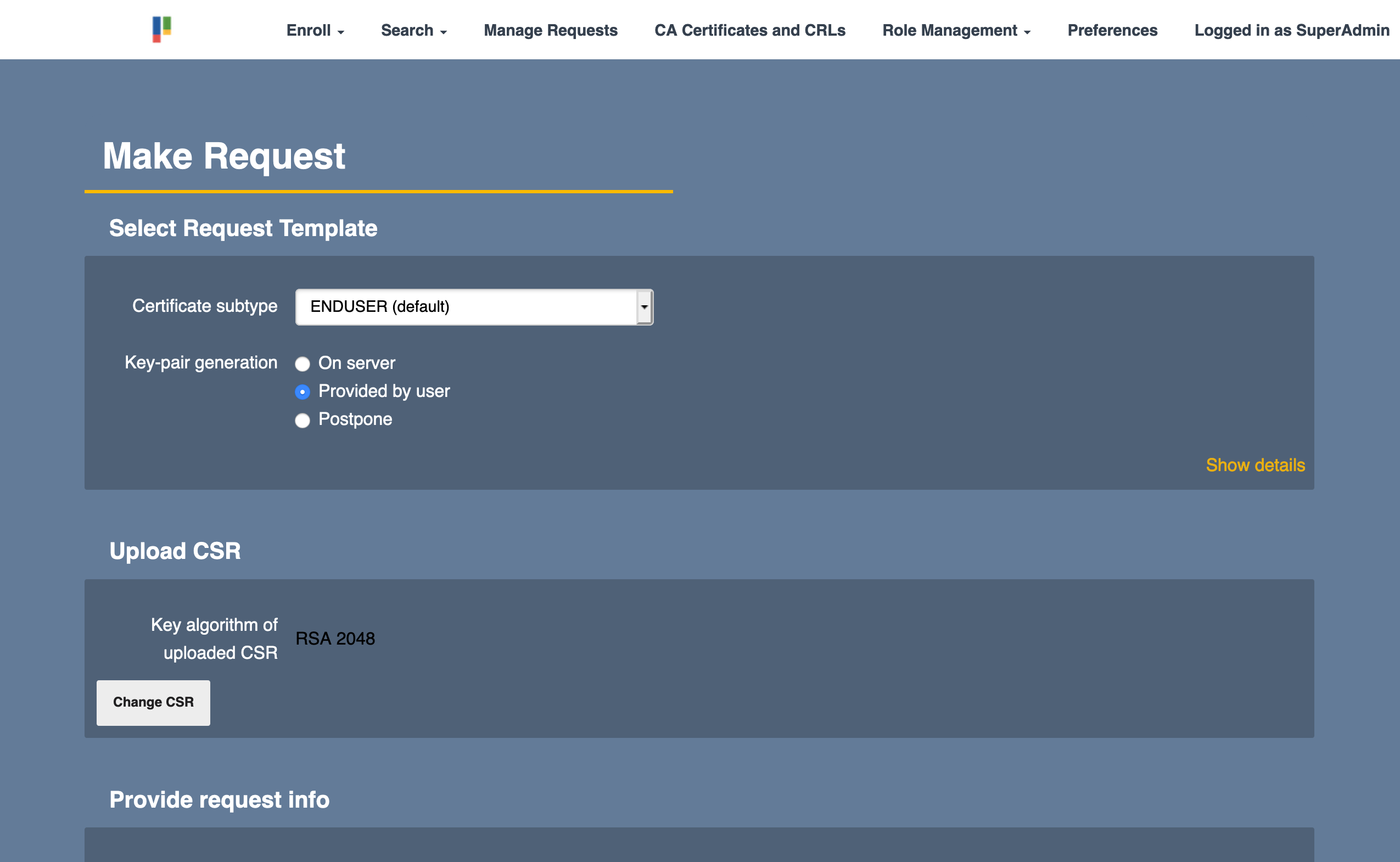 To enroll the newly created key pair using the EJBCA RA UI, do the following: