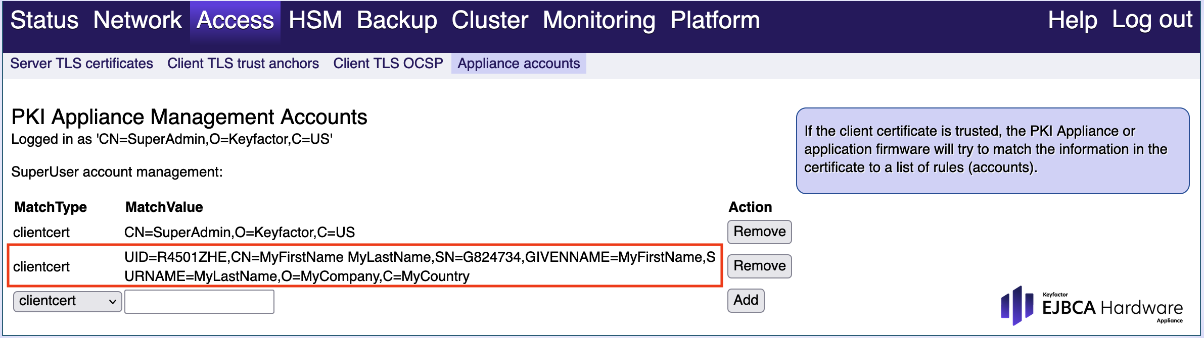 In the section PKI Appliance Management Accounts, select clientcert, provide the following SubjectDN and click Add.