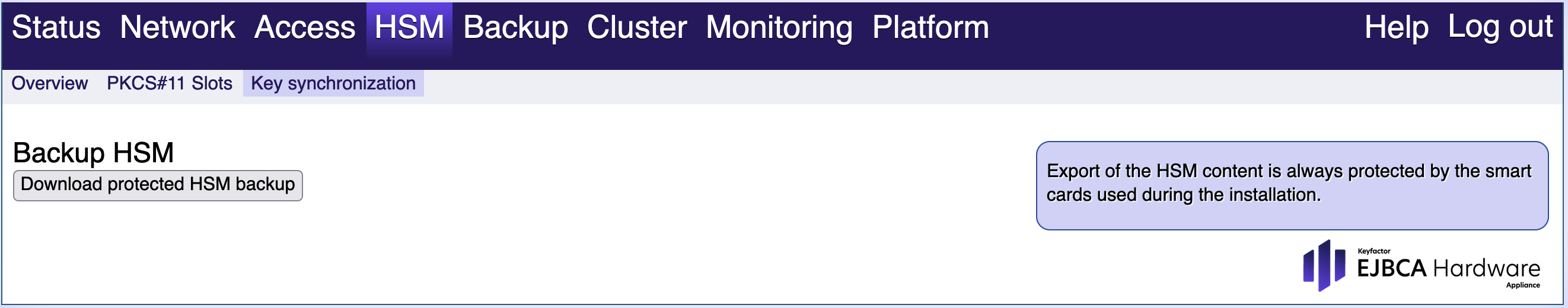 If you create a new key in the HSM through EJBCA (e.g. creating a new CA), the knowledge about its existence will synchronize through the database, but the key itself will not synchronize automatically. Hence, you will have to manually distribute this new key data by downloading a Key Synchronization Package on the Node where you created the new CA and uploading it to each of the other nodes. The applications (EJBCA, SignServer) will automatically be restarted, so that the key material can be used.