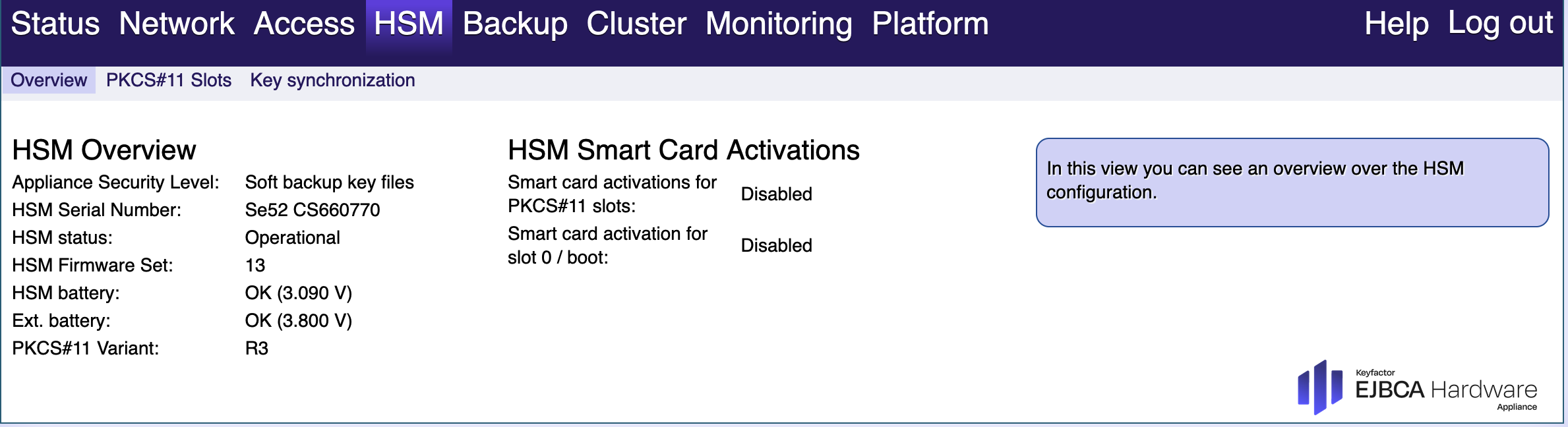 In the HSM tab and subtabs, you can configure the Hardware Security Module (HSM) of the Hardware Appliance.