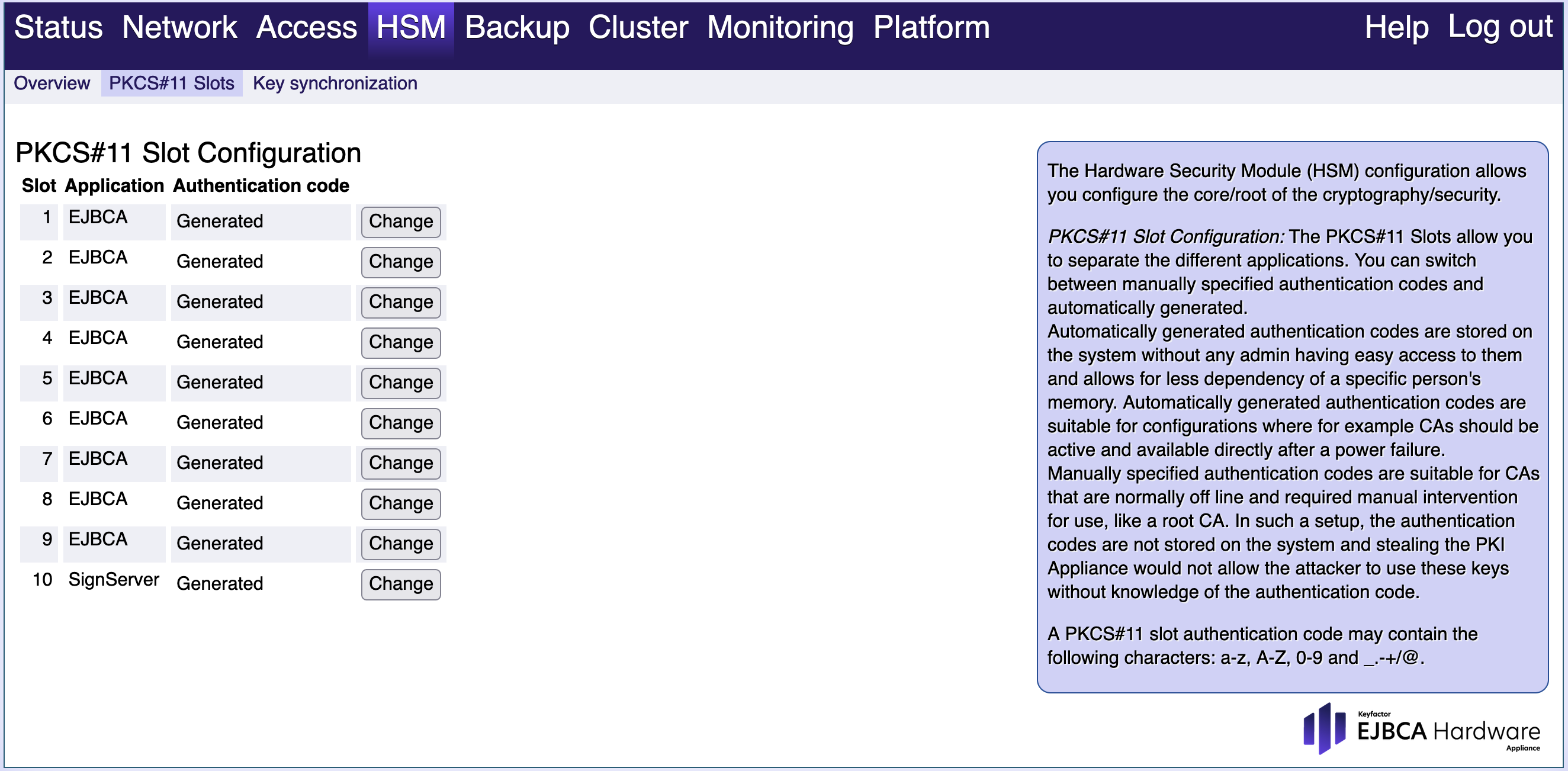 You can switch between automatically generated or manually specified authentication codes. By default, all slots are configured to be used with automatically generated authentication codes. Those are stored in EJBCA and have auto-activation enabled.